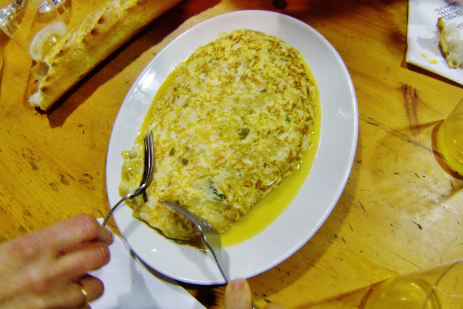 Полное меню: Чоризо, омлет из трески, треска в зеленом соусе, стейк из говядины на гриле, сыр с орехами и айвой.
